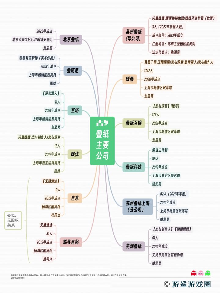 叠纸子公司数量相对米哈游要少一些,母公司苏州叠纸网络科技股份,苏州叠纸之下有上海暖叠、上海叠纸、芜湖叠纸、叠纸互娱、叠阿尼…