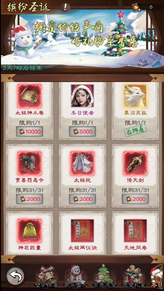 活动期间使用【圣诞铃铛】兑换奖励,不但有辉月使新皮肤【冬日使者】,还有【黑沼灵狐】的限时返场,更有各红品功法,神兵利器,走过路过不要错过~