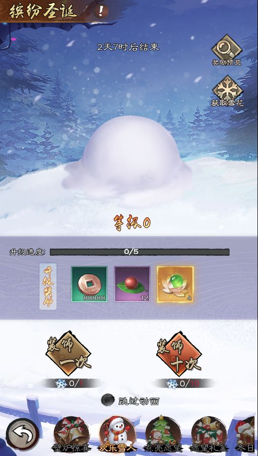 消耗【雪花】来装饰雪人。装饰有概率暴击提供2-5倍经验。雪人经验条满后可获得升级奖励,包括【许愿星】及各种养成材料。