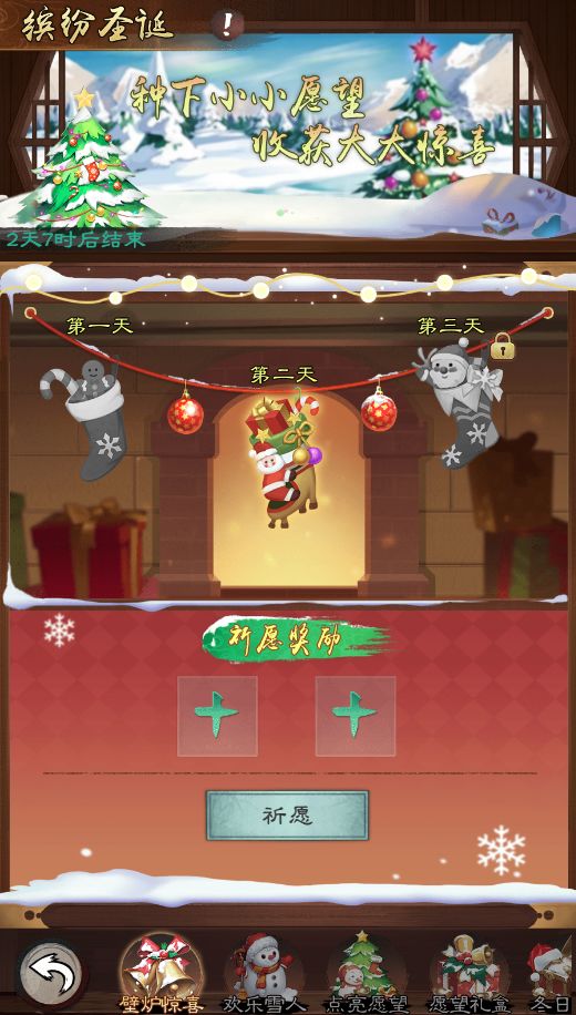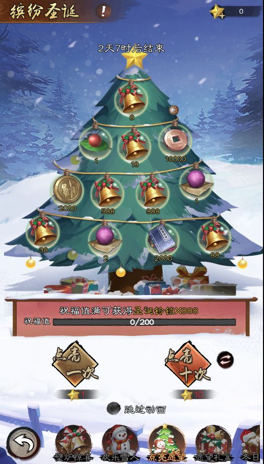 消耗【许愿星】来点亮圣诞树,每次点亮增加1点祝福值,祝福值满必定获得【圣诞铃铛】x888!