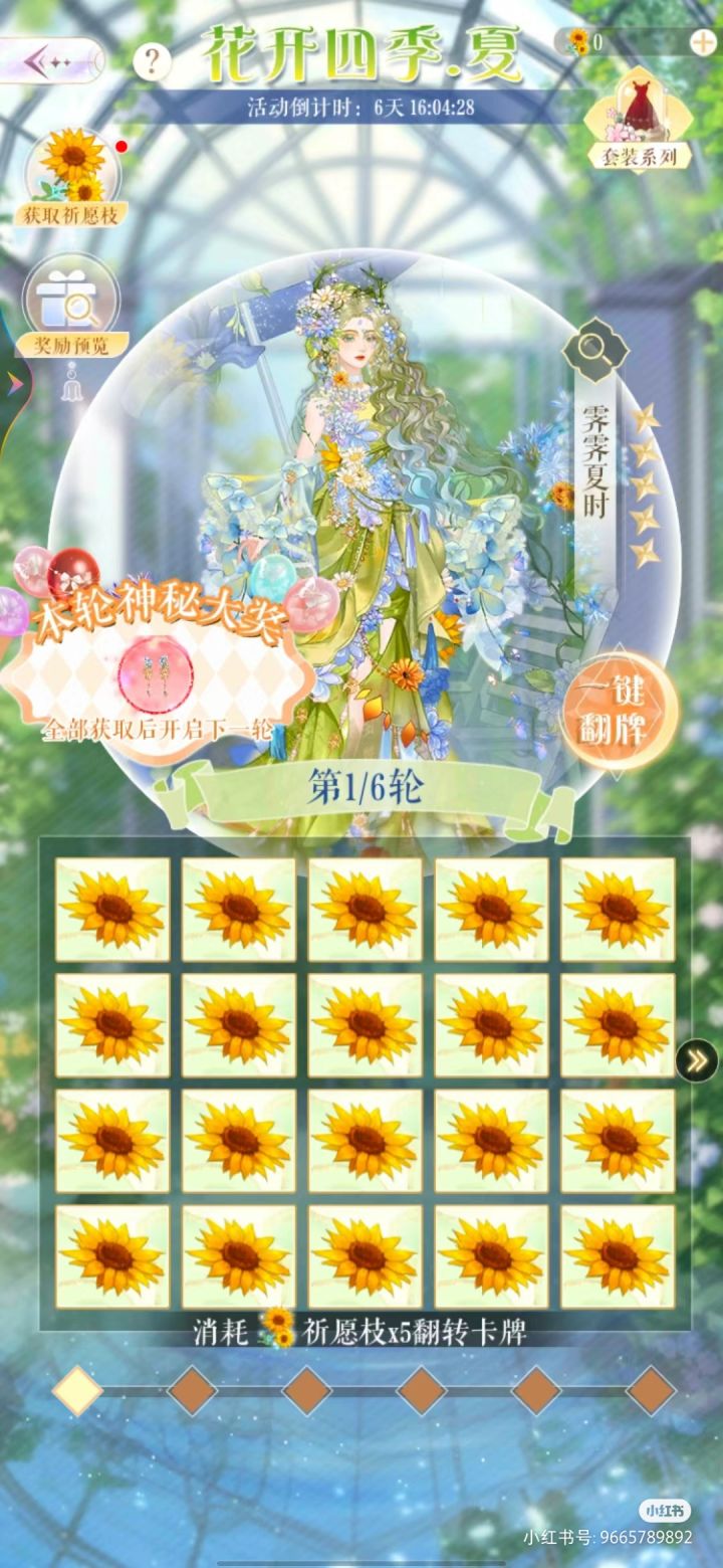 限时七日 翻牌,5祈愿枝翻一次,一层20抽保底,一共六层,需抽到本层服饰才能开启下一层