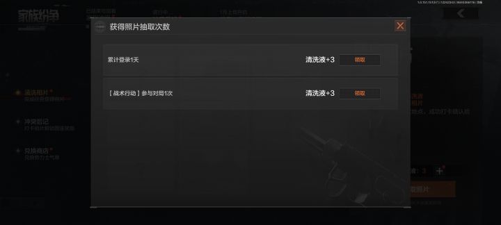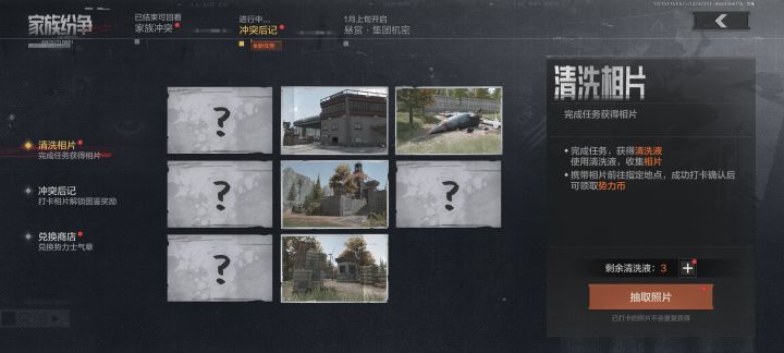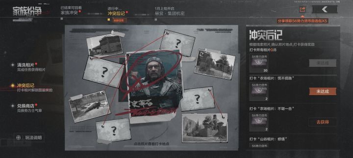 势力故事,家族冲突的后续。每天登录和战术行动对局一次会分别获得三次机会抽取相片。每张照片都会标注特定的地点,需要带入对局打卡特定地点,分别在北山、农场、山谷这三个地图中。打卡成功后会记录成功一次,完成特定次数会获得势力货币自选箱,每个箱子里有100势力币。注意照片带入对局后不可以移动到其它容器内否则直接销毁。对局失败,除非在保险箱内也会直接销毁。