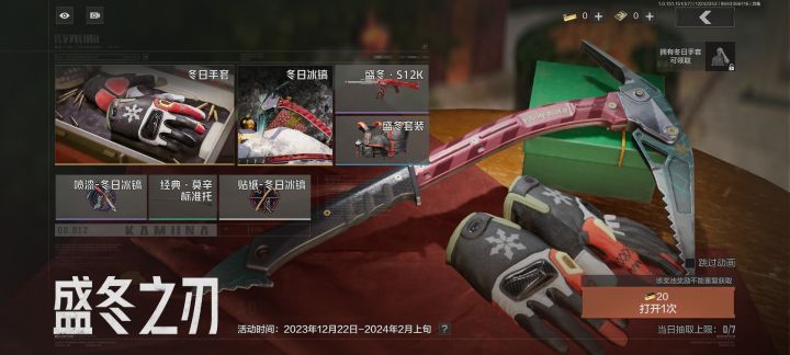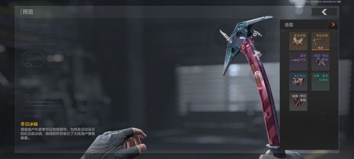 临近圣诞节暗区也是出了一个相关主题的奖池,会持续到24年的2月上旬。个人猜测赛季可能会在这个时候结束。奖池的主要大奖是一把近战武器:冬日冰镐 这把武器个人觉得外观一般检视动作也不是很帅,颜控兄弟们三思而后氪。但是从实用来讲它的二连击是真的快,比军用匕手还要更胜一筹,伤害也比匕首高。但连击之后有一段后摇还是有点长,打人要把握好机会。其它奖励有手套、s12k、莫辛的皮肤、一个装备套装(就加了点红色儿)和喷漆贴纸。没有15日六格保险给差评,之前奖池我都会抽一次单发来个15日保险性价比还是不错的。(土豪玩家可以全文略过)