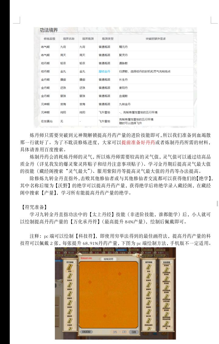 注释:pc端可以绘制【科技符】,即使用穷举法得到的最佳画符法,提高丹药产量的科技符可以佩戴2张,每张提升68.91%丹药产量,下图为pc端绘制方法,手机版不一定适用。