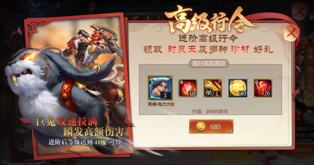 进阶高级行令后达到等级10即可领取荀彧*兔力大仙换装!仅需680梦三币购买高级行令,就可以解锁高级行令奖励的领取资格,获得丰厚的奖励!