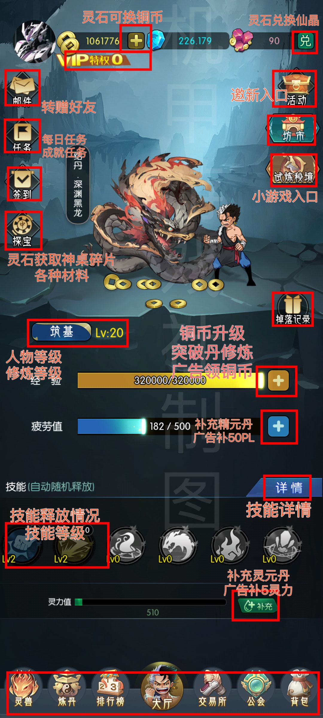 六大技能普攻掉落铜币,铜币升级人物等级。普通技能掉落突破丹材料,精元丹材料,灵兽丹材料。(消耗20灵力)金木水火土技能掉落对应神兽碎片以及对应灵丹材料。(消耗10灵力)每个技能释放都是不同的动画效果,每个技能升级同样需要灵石,每天释放技能上限30次。