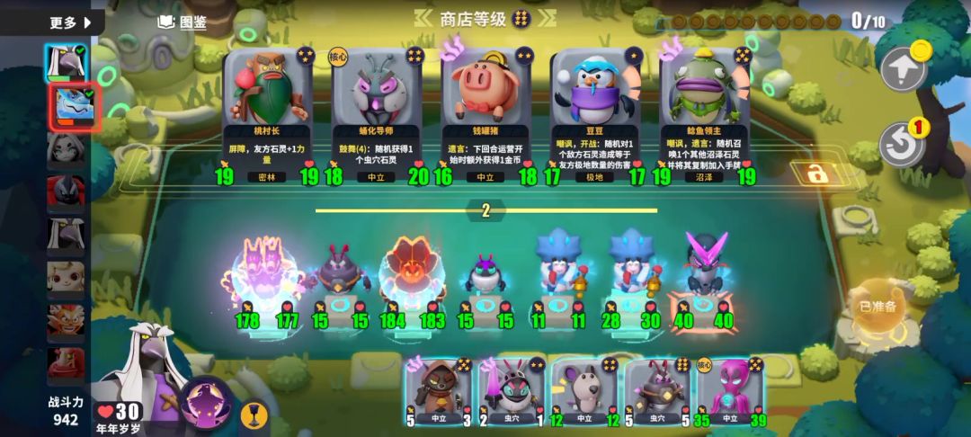 这把打法围绕吸收实体为核心,快速升级商店获得吸收实体,同时为了保住血线选择了打架能力强势的两个灵宝,五级商店后,构筑以吸收实体为核心的虫穴成长流,同时金蛋开出青灵龙与奇迹奶牛配合刷属性。第二关难度同样不大。