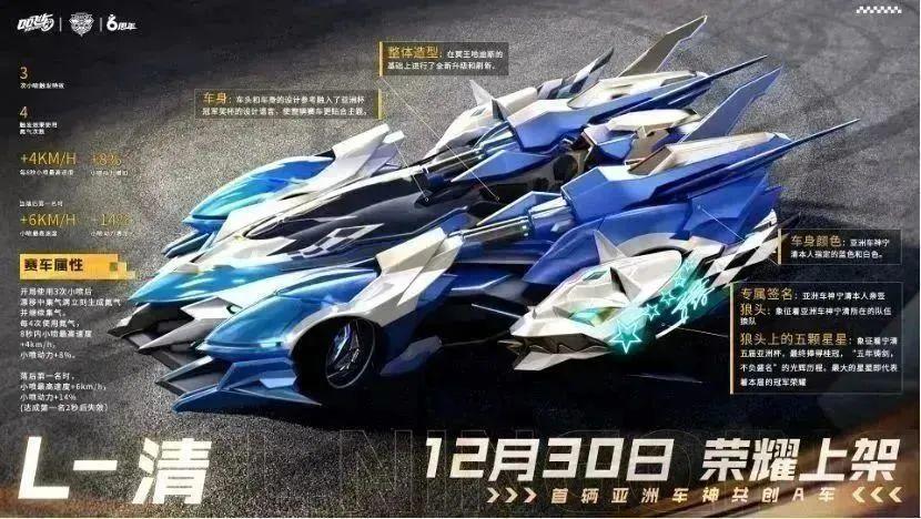 五年铸剑,不负盛名!2023年12月30日-2024年2月29日,亚洲车神共创A车L-清重磅首发!车手们可前往寻宝-工坊,使用L-清专属能源/橙光能源(售价30钻石/个)进行打造获取~