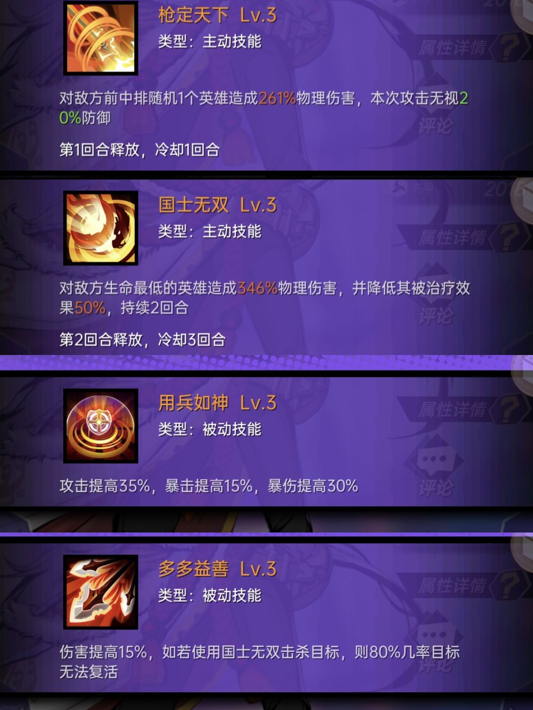 韩信:被忽视的副C。一技能1回合冷却带穿甲,2技能加30爆伤,3技能对生命值最低的进行高倍率输出,80%不可复活。输出节奏比真田好很多。