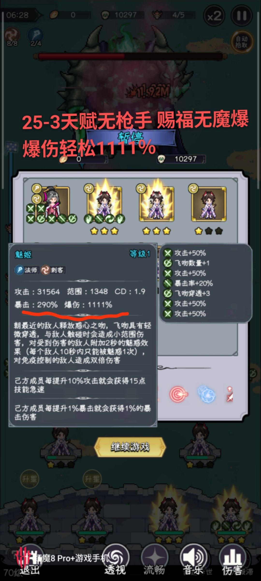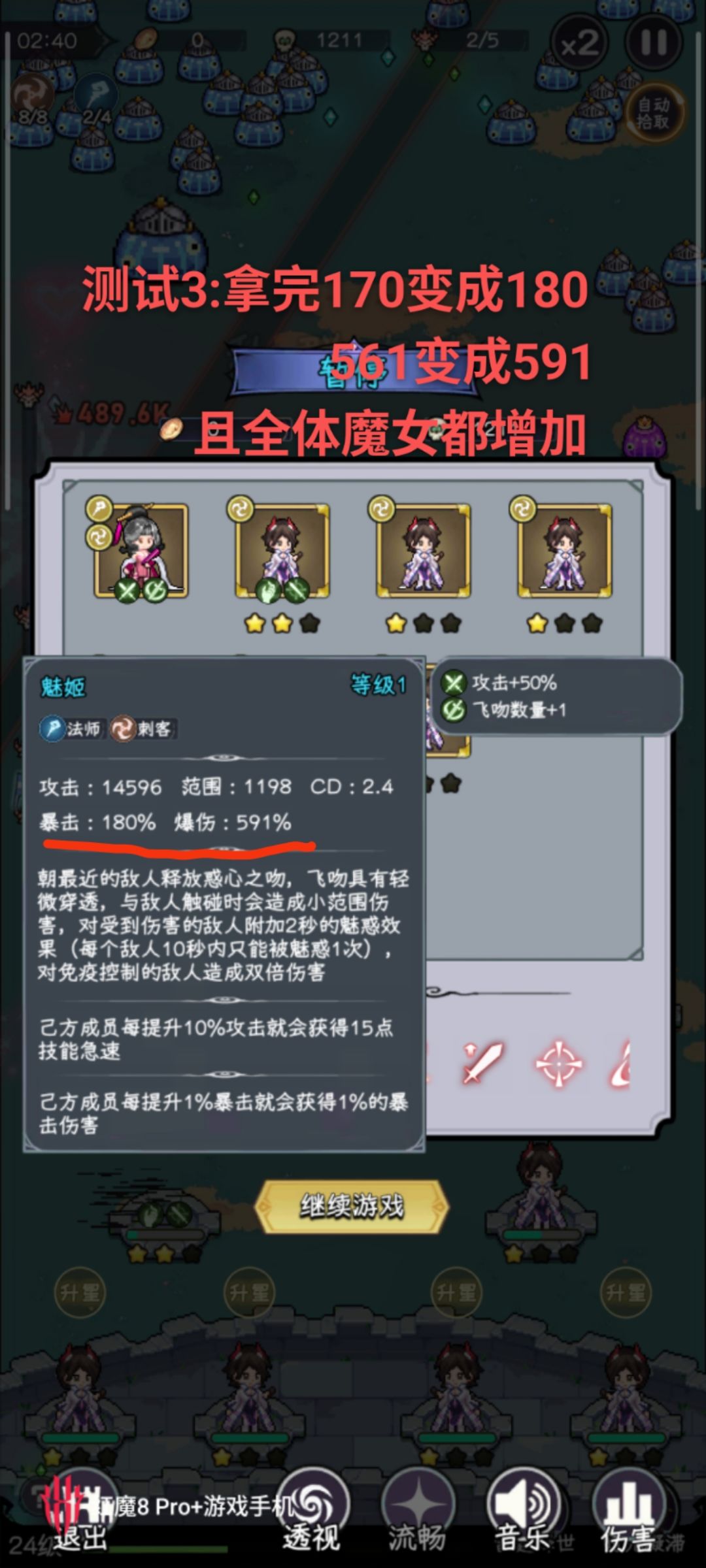 ⑥关于爆伤如此高是否是bug,经测试不是bug。。首先科普暴击率满的情况下,再拿暴击率除了会加暴击,同时会加双倍爆伤。这样在拿到凝神buff后,拿+5%暴击,实际是+10%暴击,因为暴击满了后1:2转化爆伤,所以是+20%爆伤,又因为新指挥官魅姬自身天赋(暴击1:1增加爆伤),所以10%暴击又+10%爆伤。因此+5%暴击 等于 +10%暴击+30%爆伤,所以新指挥官暴击伤面板才能轻松过1500。
