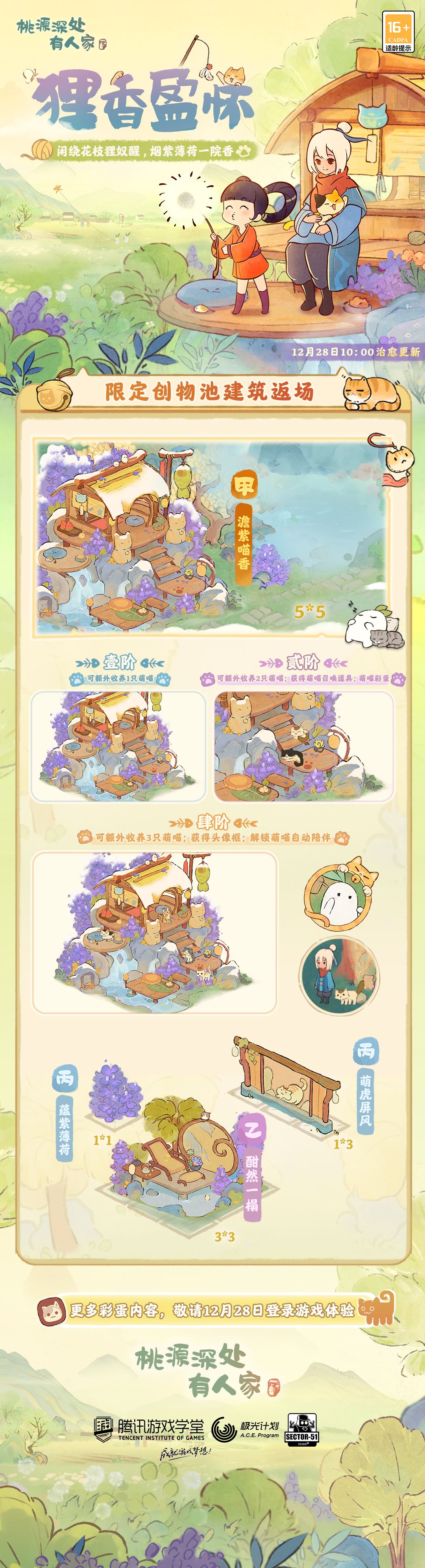 山民们可以在此创物池中获取甲等建筑「澹紫喵香」,被紫花环绕的可爱喵居,不仅能收养更多猫咪,还能在山上各处用铃铛召唤小猫出现,喜爱猫咪的山民不要错过萝!