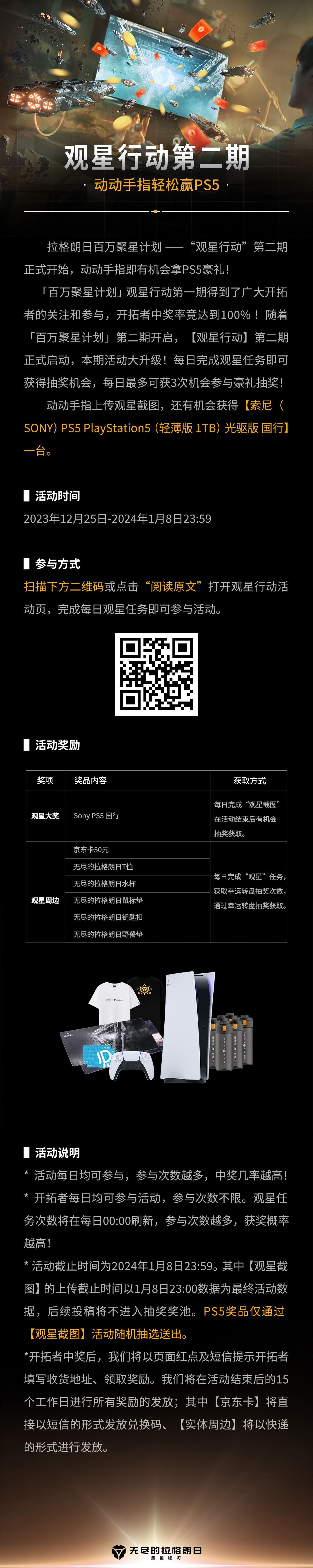◇ 拉格朗日百万聚星计划 ——“观星行动”第二期正式开始,动动手指即有机会拿PS5豪礼!
