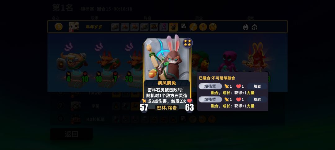 本局游戏前中期通过判官技能保护血线,4级商店时搜索 疾风剑兔 融核蟹 神秘狐 核心牌,后逐步成型阵容。本局游戏过渡较为平稳,是一把胡牌局。