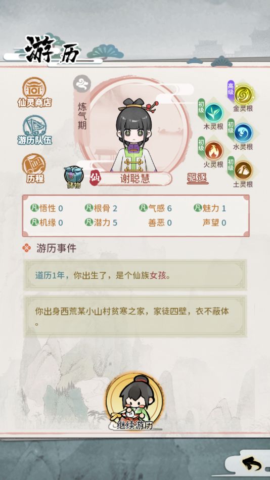 点击下方的继续游历按钮将会触发不同的事件和故事,有可能会得到属性加成,或是触发战斗,亦或者是...生死之危?!