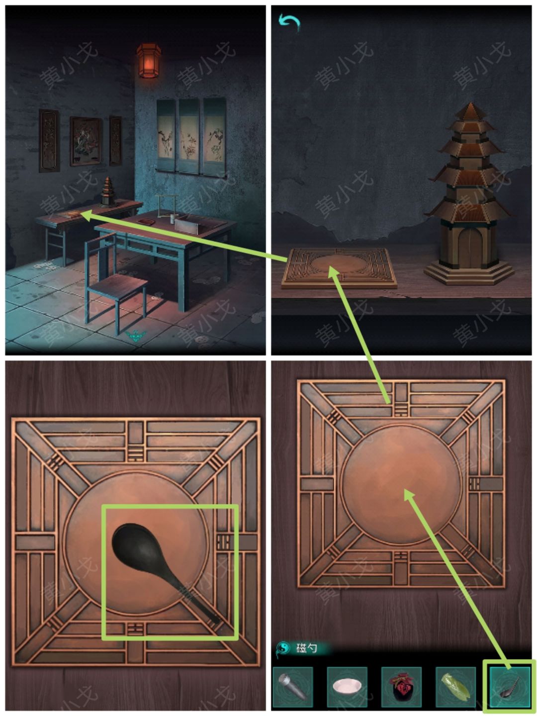 1.(祠堂-书房)点击靠墙的桌子上的司南,放上【磁勺】,获得线索(勺柄指向为南)