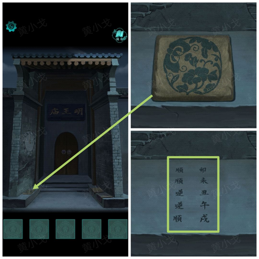 1.(明王庙外)点击左边石阶上的蒲团,挪开,获得线索(顺顺逆逆顺 卯未丑午戌)