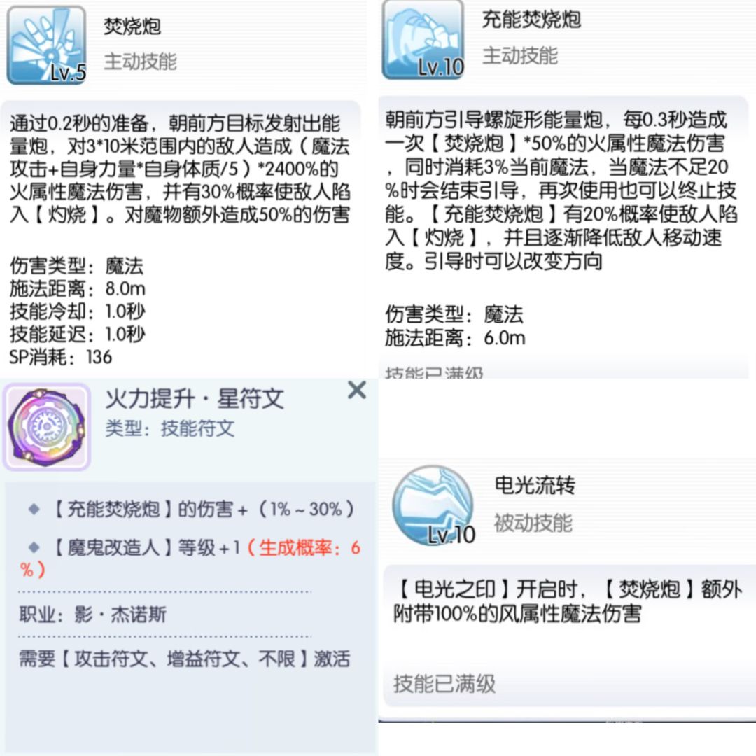 初始技能焚烧炮 2400%,常用技能充能焚烧炮单次为(1200%的火属性+1200%的风属性)魔法伤害,每0.3秒一次