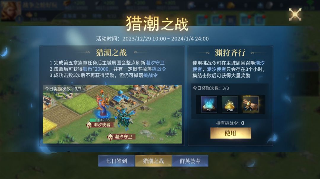 活动期间,主城范围整点内会刷出【潮汐守卫】,击败【潮汐守卫】即可获得银币奖励与活动道具【挑战令】。 使用【挑战令】可以召唤出强大的【潮汐使者】,与盟友集结并成功击败【潮汐使者】即可获得丰富奖励!