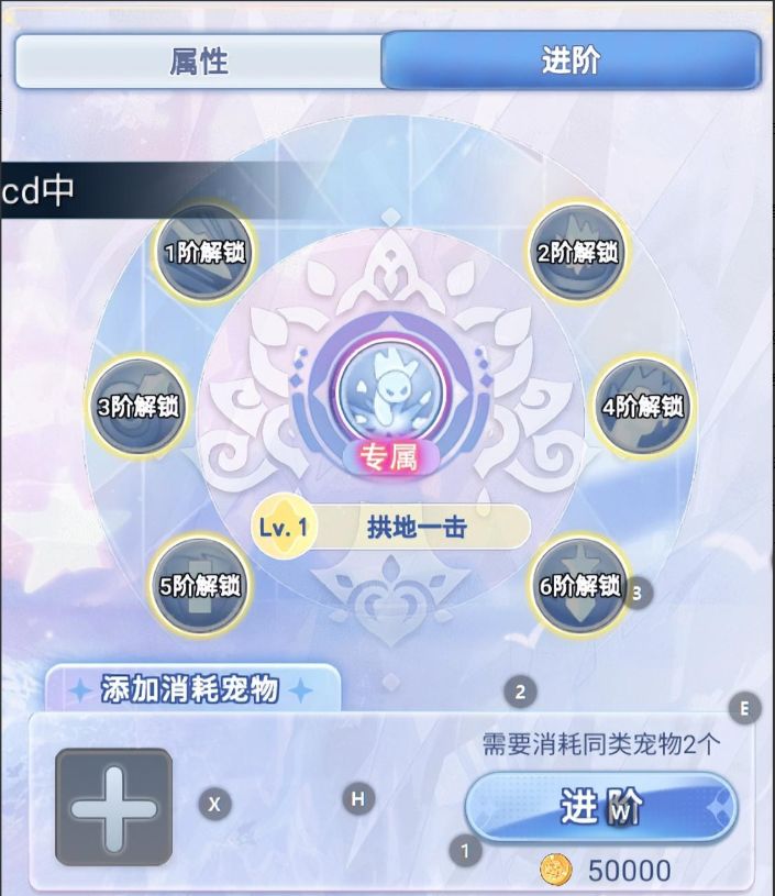 4.宠物拥有专属技能和进阶技能,进阶技能升1阶开启1个,专属技能上阵后自动释放,进阶技能为被动技能,上阵后可增加属性。不同种类的宠物的专属技能不一样。