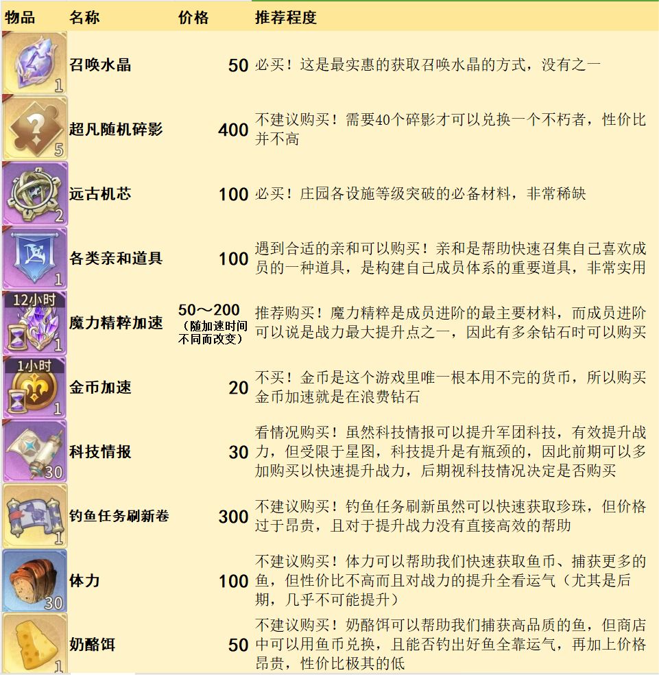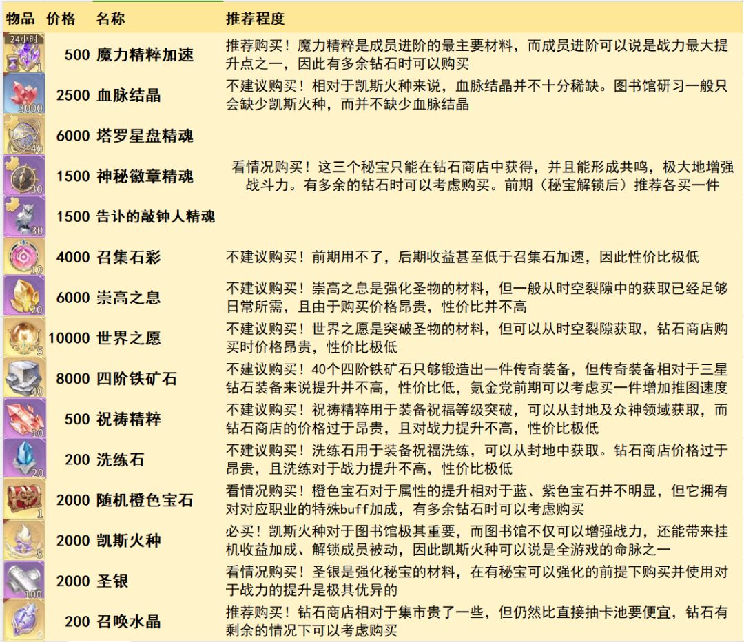 钻石商店每周刷新,是更高效地帮助提升战力的地方。同样地,整理了一份购物清单,供大家参考: