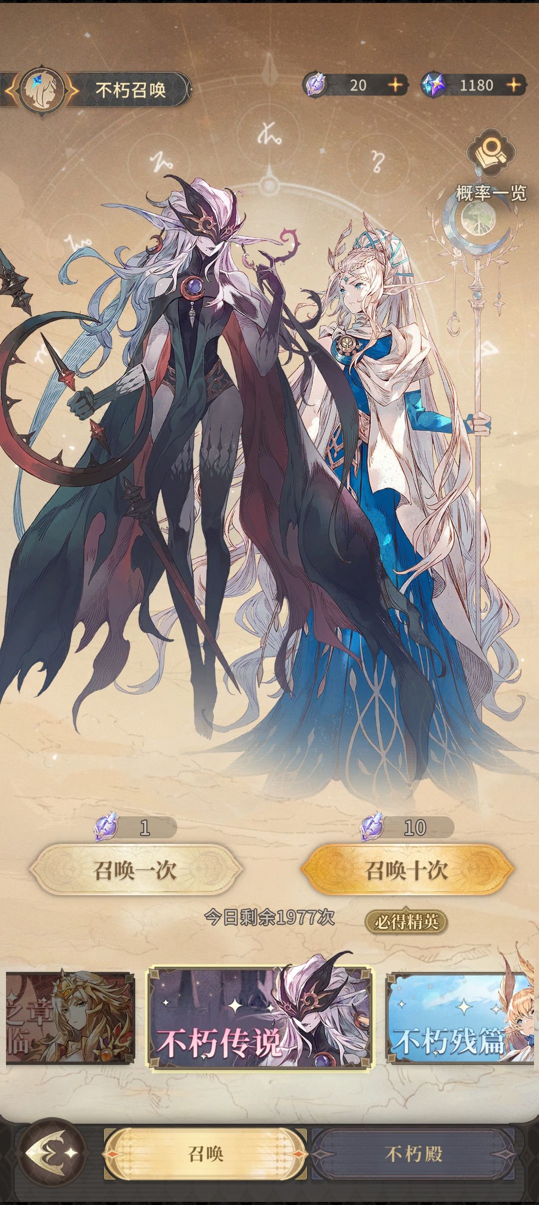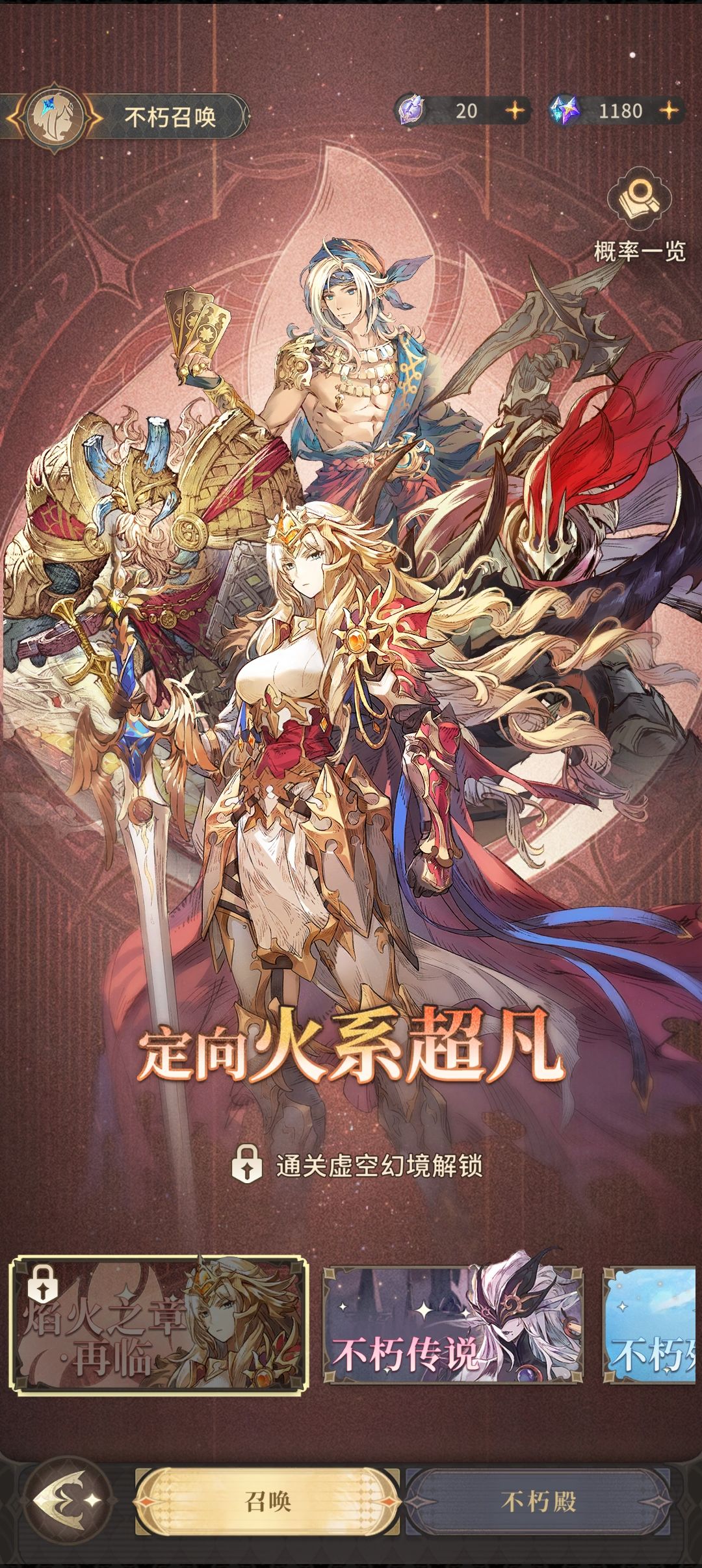不朽殿需要花费钻石的不朽者召唤分为不朽传说(普池、常驻池)及up池(如焰火之章是火属性up池)(目前up池只在每一大关通关后开放3天)