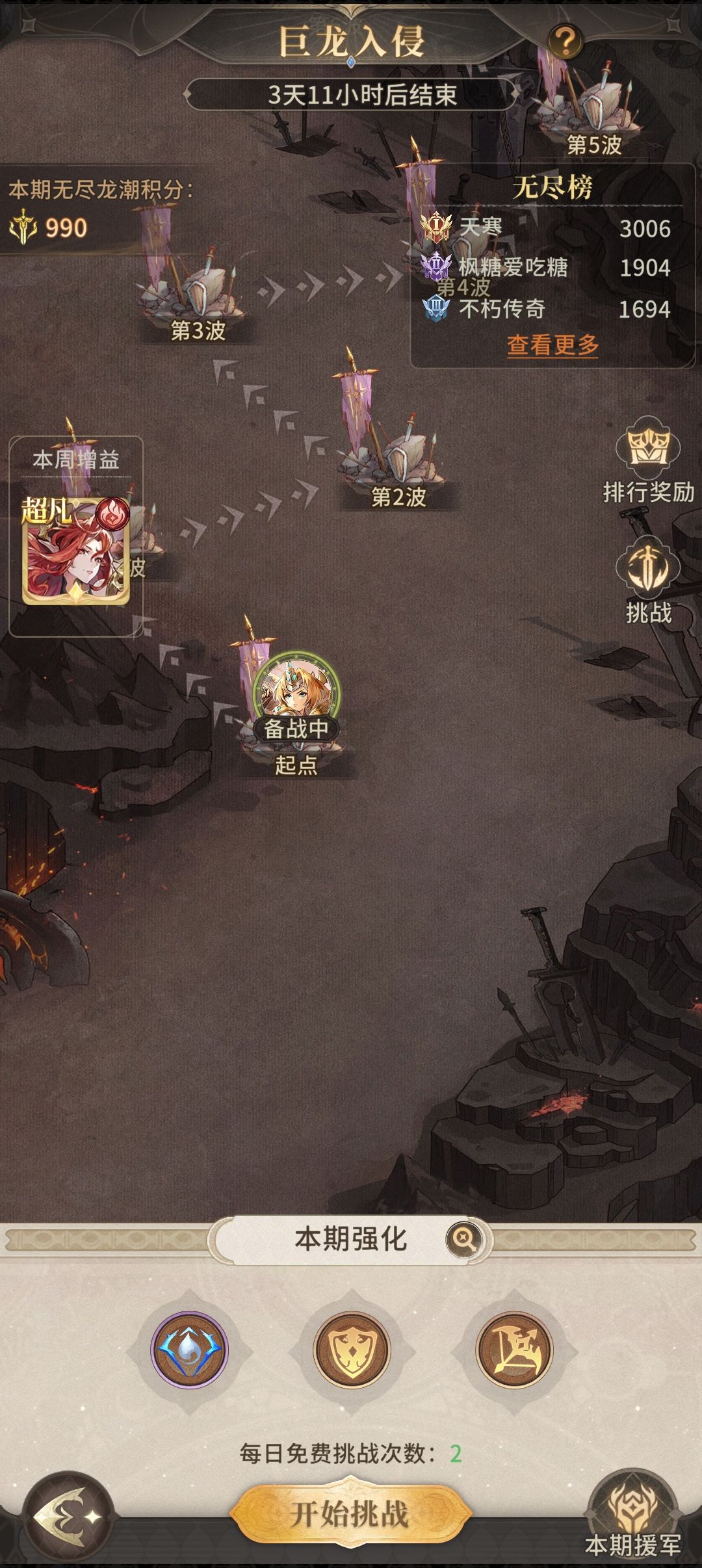 巨龙入侵挑战机会购买花费的钻石是第一次50,第二次100,依次类推。
