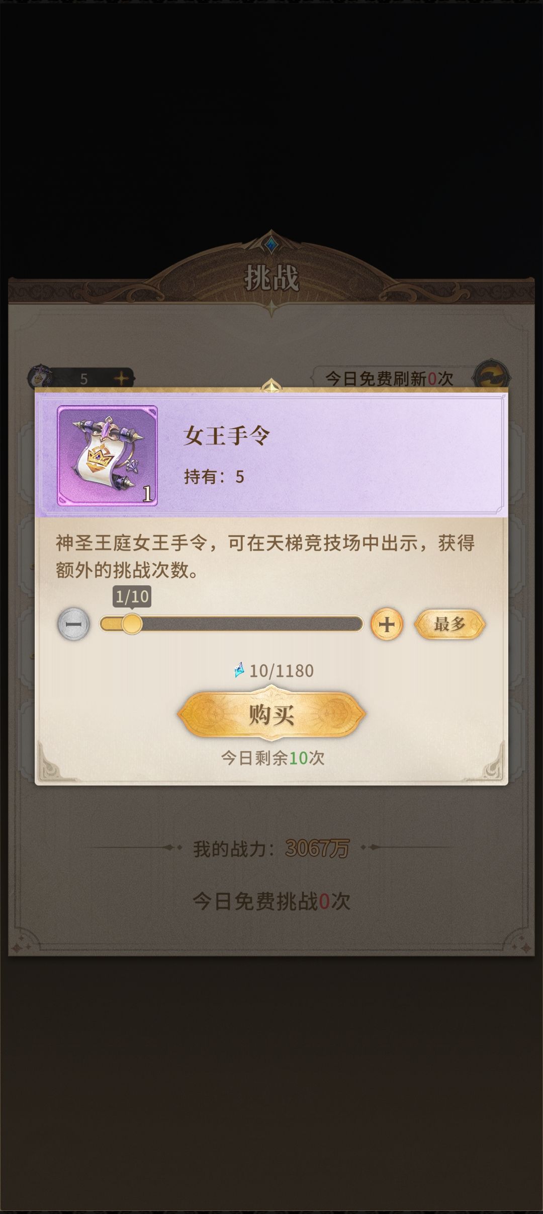 挑战机会可以视情况买一次10钻的,其他的除非你要冲榜且很有自信,否则千万不要购买!