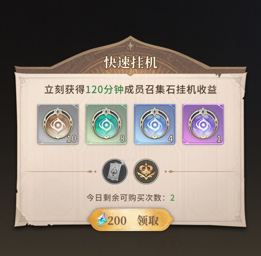200钻石可以获取2小时召集石挂机收益。