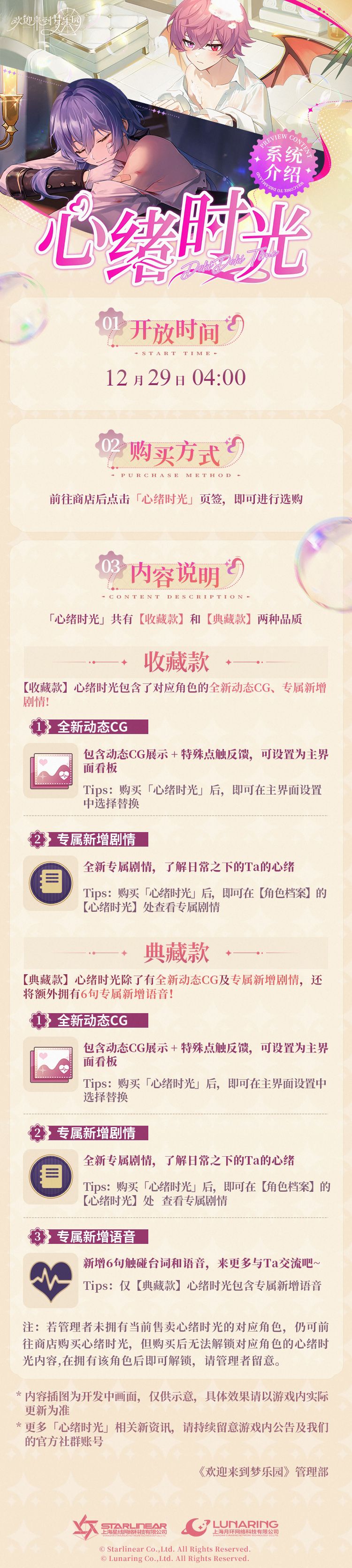 ※ 若管理者未拥有当前售卖「心绪时光」的对应角色,仍可前往商店购买「心绪时光」,但购买后无法解锁对应角色的「心绪时光」内容,在拥有该角色后即可解锁,请管理者留意。