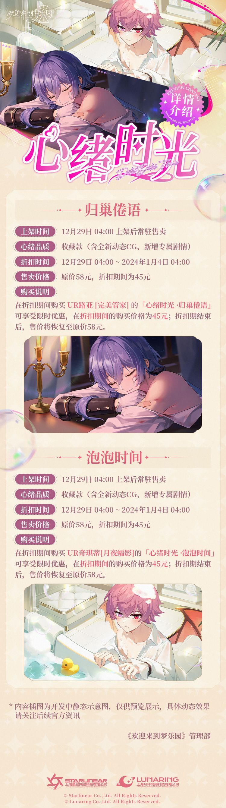 - 购买说明:在折扣期间购买UR奇琪蒂 [月夜蝠影] 的「心绪时光·泡泡时间」可享受限时优惠,在折扣期间的购买价格为45元,折扣期结束后,售价将恢复至原价58元。