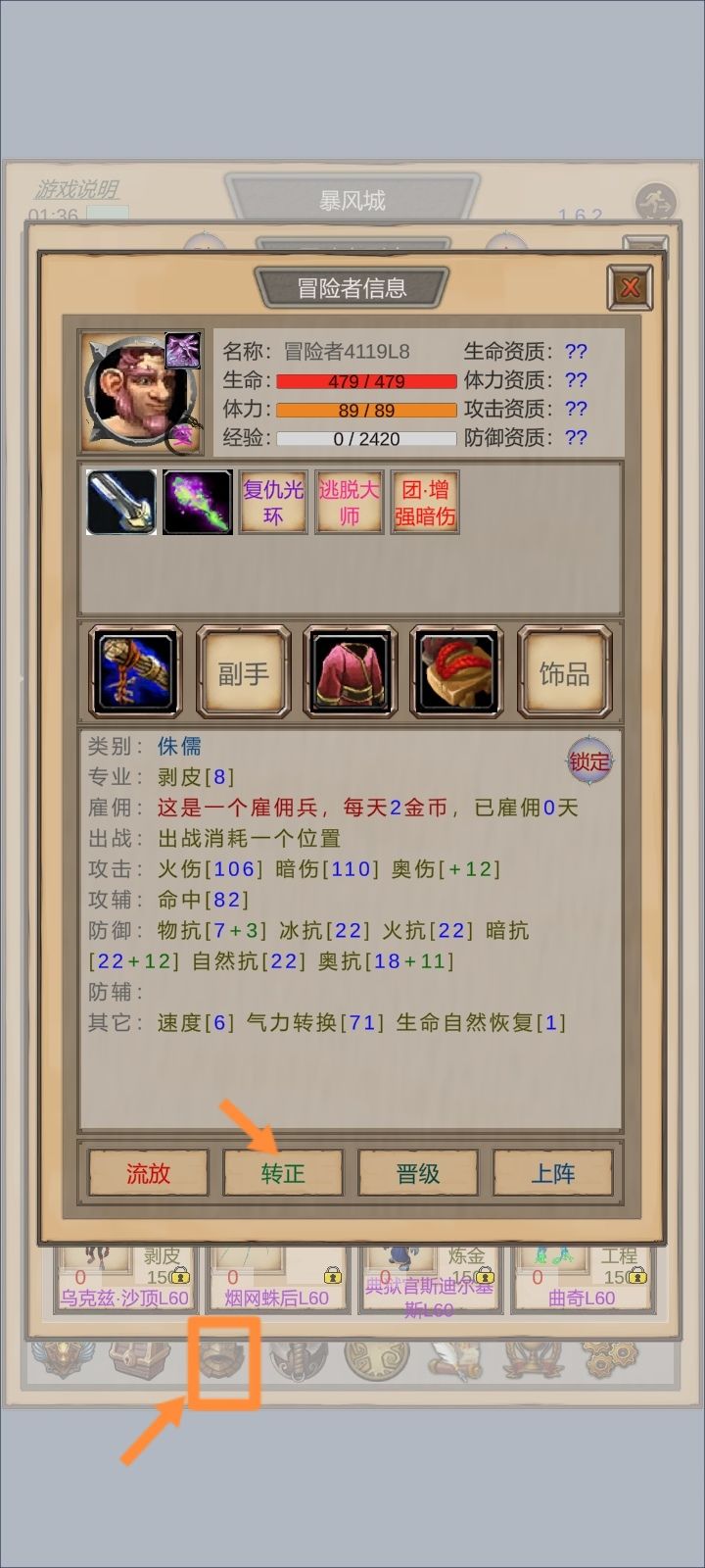 如上图,点击黄色框内标志打开佣兵界面,然后找到你需要转正或者流放的npc,点击