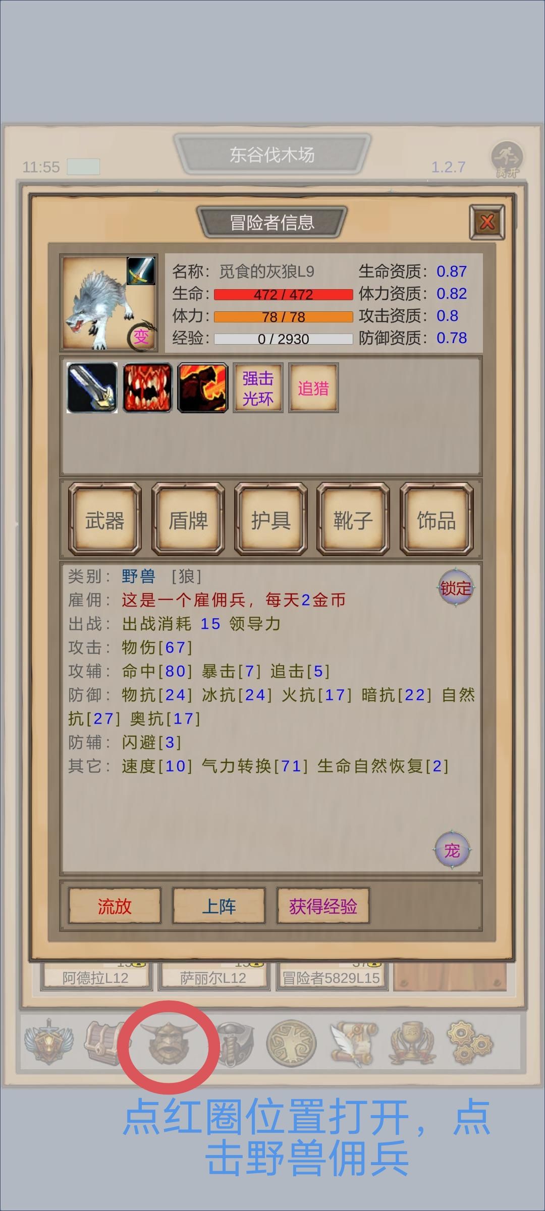 然后在佣兵小队界面。点开这只野兽的信息。右下角可以看到宠物,点击就可以,注意版本需要1.27以上的版本才有。