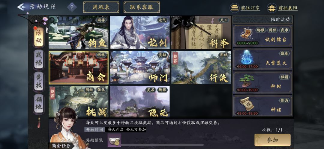 每日一轮共有10个商会任务,其中有6个任务需要通过地图刷怪来完成,另外还有4个高倍奖励的任务。高倍奖励任务需要的道具都比较珍贵,需要在各种活动中获取(少侠们一定要积极参与各类活动,最好一个都不错过),也可以通过其他少侠摊位购买获取。