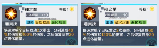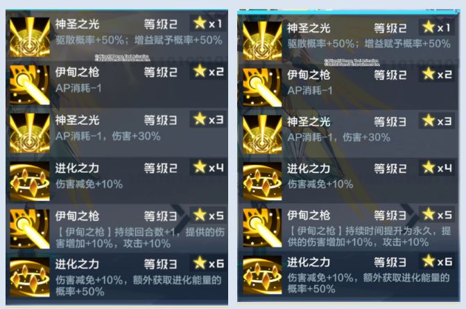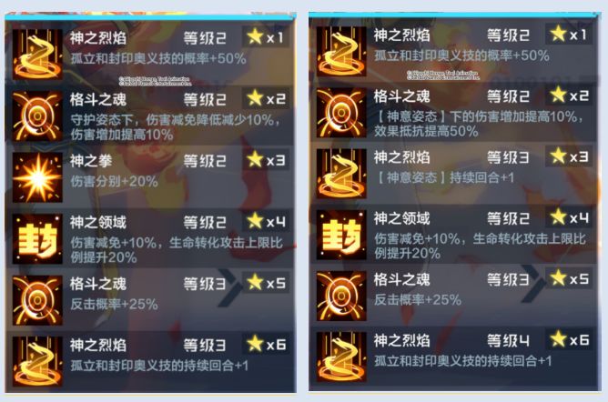 改动4:升星效果:2星效果修改为:【神意姿态】下的伤害增加提高10%,效果抵抗提高50%;删除通常技3星效果,修改为【神意姿态】持续回合+1
