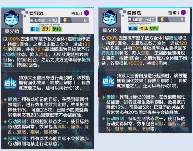 猿猴大王兽改动1:奥义技修改为只对主目标赋予混乱,删除奥义技赋予的抵抗控制效果,修改为赋予效果抵抗+5000,持续2回合