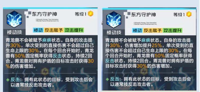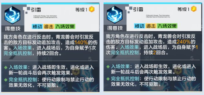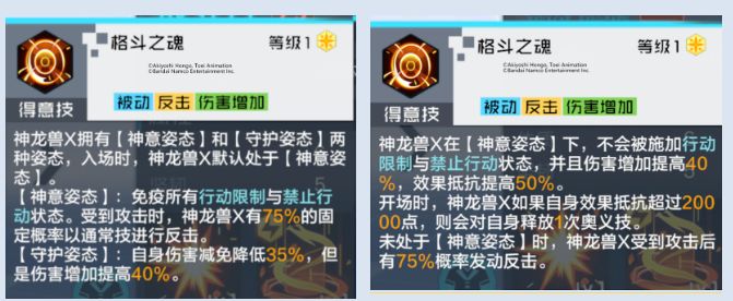 改动3:得意技重做,描述如下:神龙兽X在【神意姿态】下,不会被施加行动限制与禁止行动状态,并且伤害增加提高40%,效果抵抗提高50%。开场时,神龙兽X如果自身效果抵抗超过20000点,则会对自身释放1次奥义技。未处于【神意姿态】时,神龙兽X受到攻击后有75%概率发动反击。