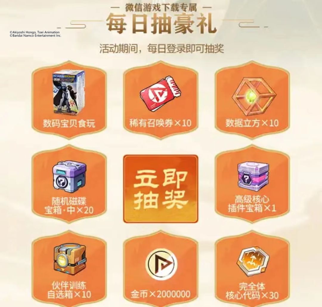 数码食玩手办(0.1%)、稀有召唤券*10(3.0%)、数据立方*10(3.0%)、随机磁碟宝箱·中*20(20%)、高级核心插件宝箱*1(10%)、伙伴训练自选箱*10(15%)、完全体核心代码*30(15.9%)、金币*2000000(33%);