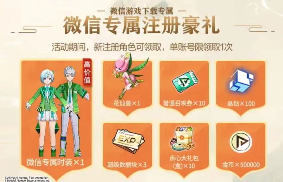 1、活动期间,新注册角色可领取微信专属豪礼,单账号总限领1次(微信专属时装×1、花仙兽×1、普通召唤券×10、晶钻×100、高级数据块×3、点心大礼包(盒)×5、金币×20000)。;