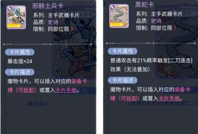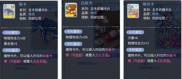 首先就是我们的物理伤害职业:剑士、盗贼、商人、弓箭手,这里推荐可以前期过渡的蓝卡:狼卡(物理攻击力+20,暴击值+3)、白蚁卡(物理攻击力+25)、蜂兵卡(力量+6,物理攻击力+11)