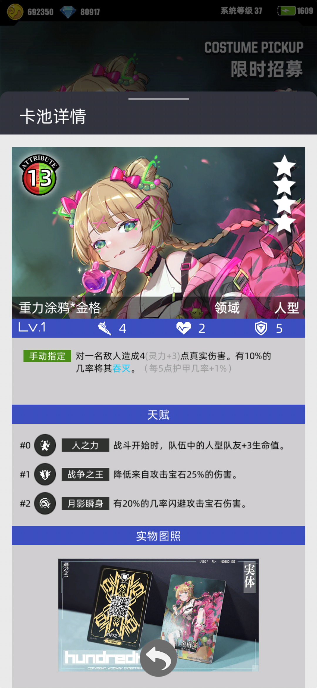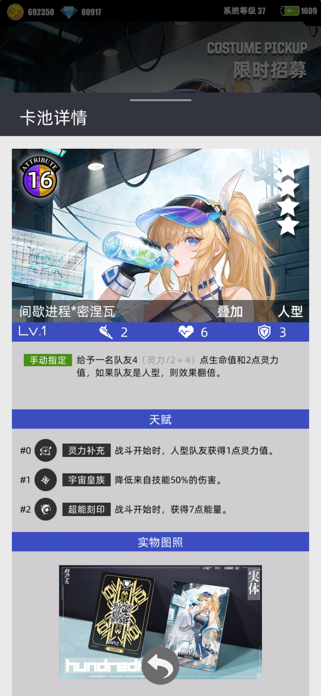 叠属性,16高额能量,本身没有额外回合,放技能就是浪费一个回合,叠的属性也不高,比起其他的叠属性卡差很多,人形翻倍,但综合价值还是很一般