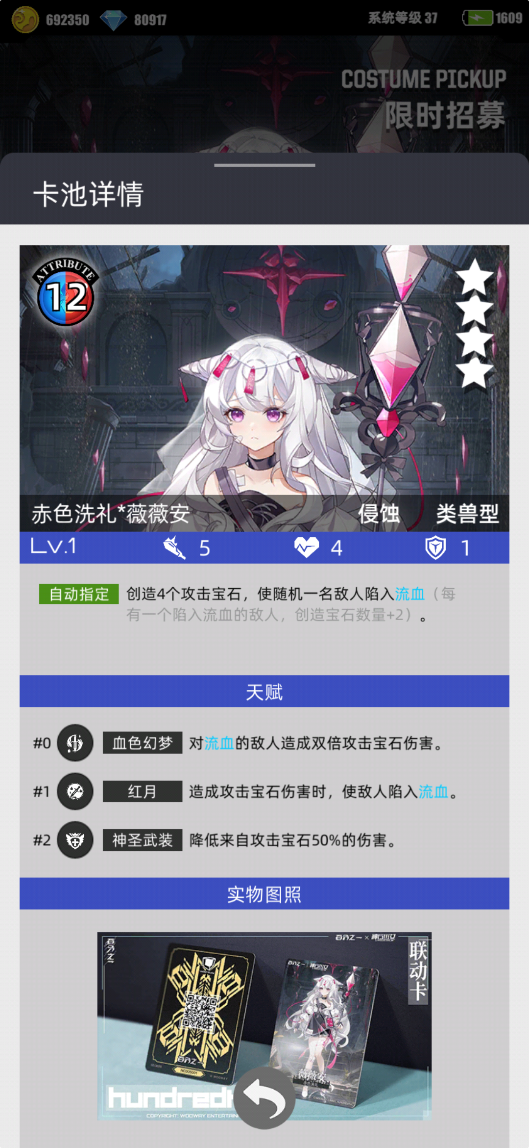 老卡,叠甲吞,跟叠甲队一起上场可以作为主力吞灭,以前常见是用主角武器黄昏叠甲,现在叠甲的东西多了不一定非得上黄昏,其他的叠甲也可以,如果有免吞的敌人可以用眩晕,或者直接吞灭其他单位手动操作菜刀把对面踢死,虽然不如以前那样的地位,但是还是一个很不错的吞灭卡了,值得一抽