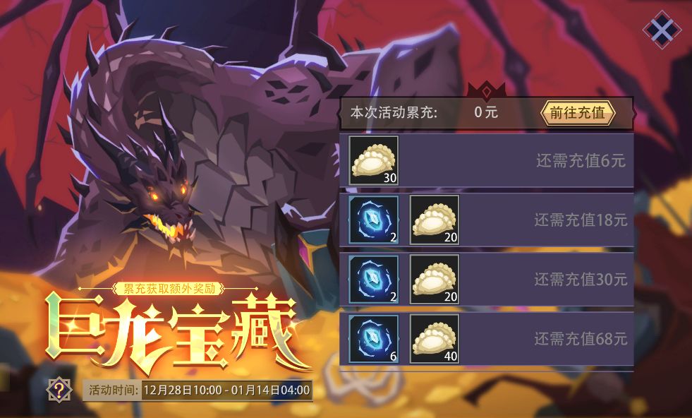 活动内容:活动期间,以任意形式累计充值金额达到指定额度,即可领取“英魂”、“饺子”、“稀有货币抉择箱”等额外奖励。