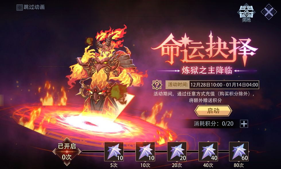 活动内容:活动期间,通过任意方式充值(购买积分除外)额外赠送“积分”,1元等于1“积分”。需要消耗“积分”来启动游戏,可获得神系英雄[炼狱之主]、卡背[烈火炼狱]、新皮肤[末日终结者]、全新的4个“动态头像”等。