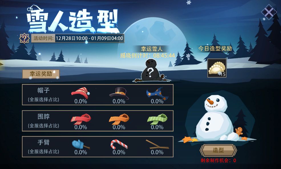 活动内容:活动期间,每日击败精英或首领,可以获得一次造型机会。此时可选择“帽子”、“围脖”、“手臂”来装饰你的雪人,可获得造型奖励。每日24:00时,系统会自动揭晓当日“幸运雪人”;还会根据你的雪人的相似部分来发放额外的奖励。