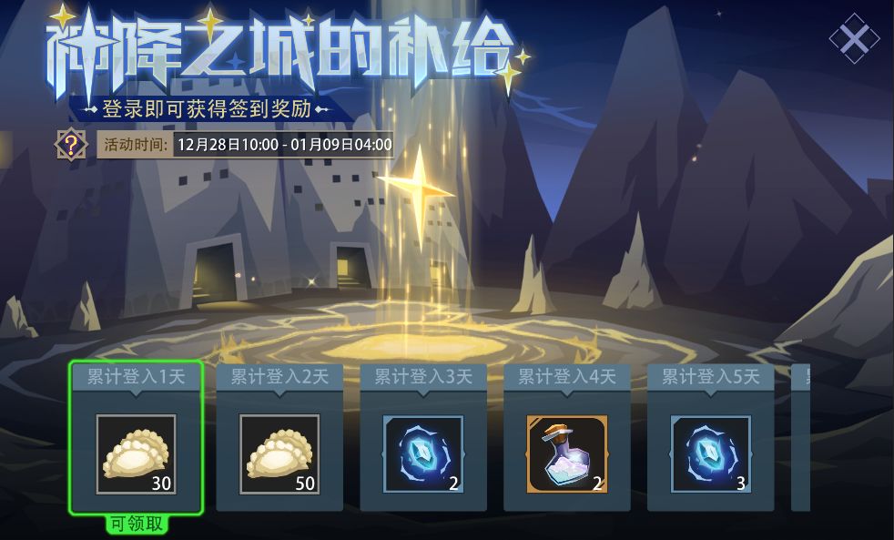 活动内容:受光之女神的庇佑,神降之城物资丰厚。活动期间,每日登录游戏即可领取“饺子”、“幻彩之尘”、“王者英魂”等丰厚奖励。