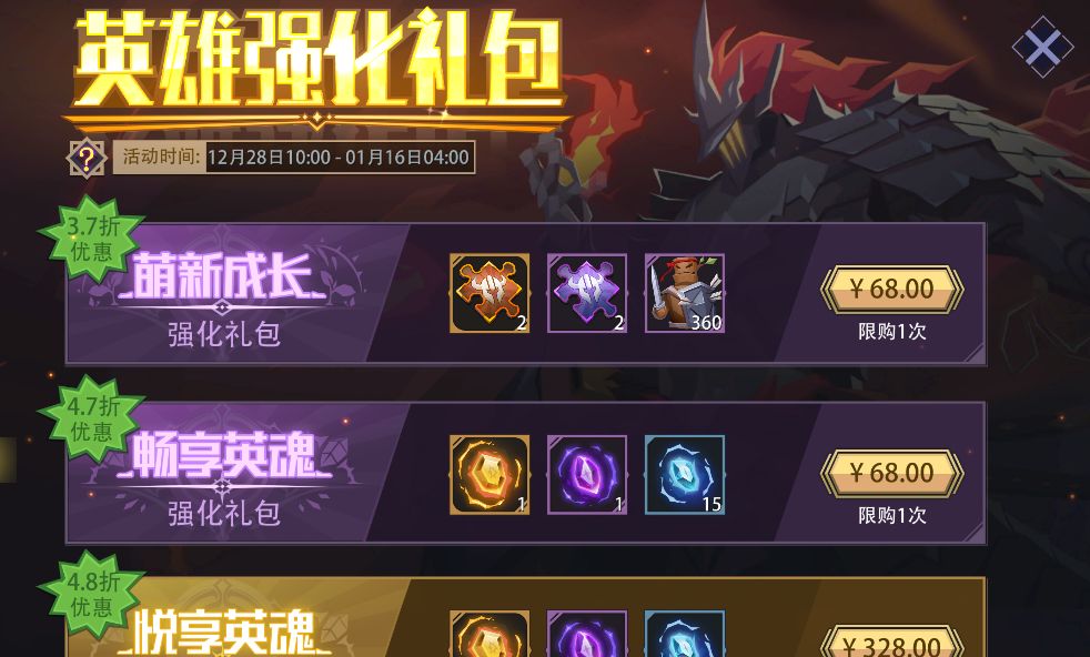 活动内容:活动期间,开放[萌新成长强化礼包]、[史诗英雄强化礼包]、[传奇英雄强化礼包]、[畅享英魂强化礼包]、[悦享英魂强化礼包]、[臻享英魂强化礼包];每种礼包活动期间限购1次。