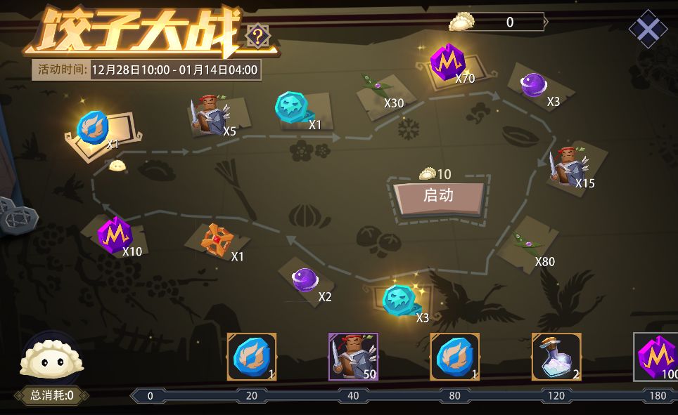 活动内容:活动期间,可消耗固定数量的“饺子”来启动游戏,获得随机奖励。每日无次数限制。 累计消耗“饺子”数量达到一定阶段时,还能领取“魂石”、“幻彩之尘”等额外奖励。