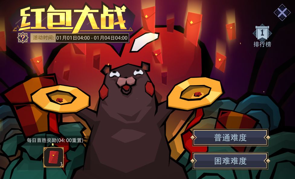 活动内容:天降红包啦!指挥玩偶去接取,看看你能得多少分。游戏分为普通、困难两种难度,无论哪种难度下进行游戏,只要每日首次胜利即可获得奖励;次日04:00刷新。挑战成功有机会进入排行榜,按照难度和分数进行排名。