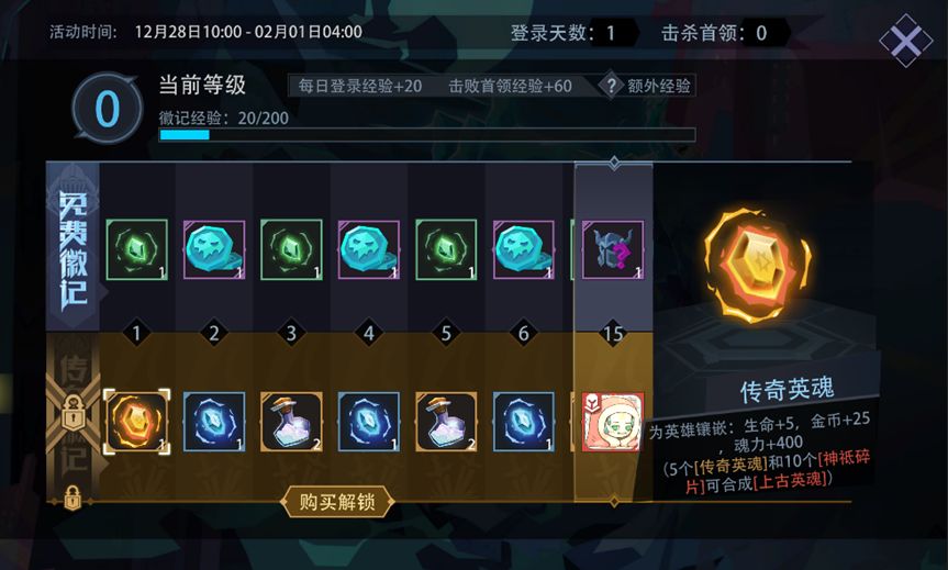 活动内容:活动期间,每日登录或击杀首领可获得经验;提升徽记等级。免费徽记默认开放,传奇徽记需购买解锁。徽记达到对应的等级,可领取对应档位的奖励。免费档为可获得勇士英魂、幻彩之尘、随机英雄等好礼;付费档可获得王者英魂、传奇英魂、幻彩之尘、神祗碎片、限定动态头像等豪礼。