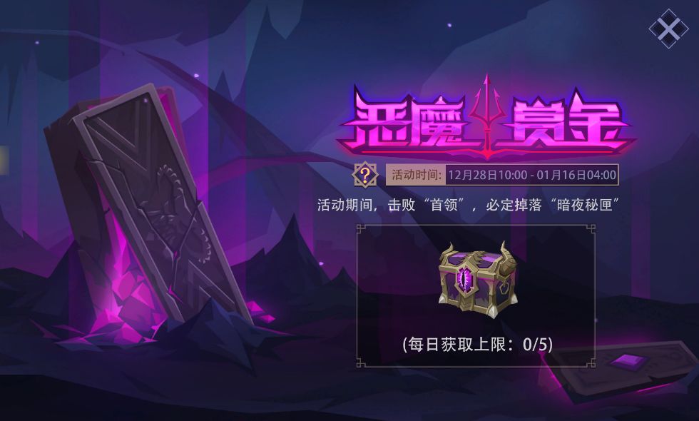 活动内容:活动期间,在[冒险模式]/[冒险试炼场]/[梦魇模式]下击败每一层的“首领”,均可掉落“暗夜秘匣”;每日上限为5个。“暗夜秘匣”打开后能获得随机数量的魔晶,还有30%几率获得“勇士英魂”。